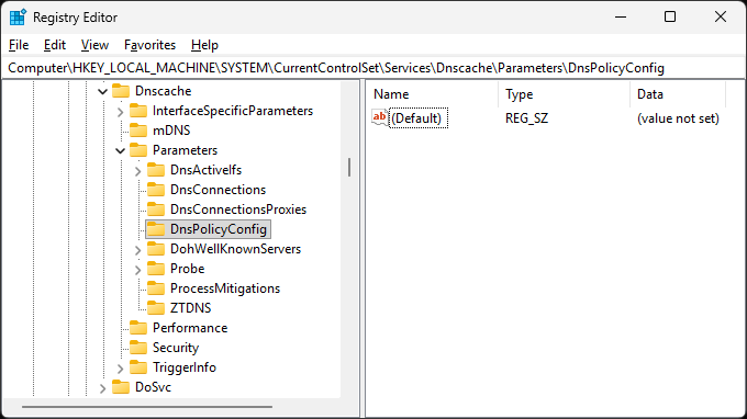 Next, we examined this registry key: HKEY_LOCAL_MACHINE\SYSTEM\CurrentControlSet\Services\Dnscache\Parameters\DnsPolicyConfig. Here is a screenshot from my desktop (not the device in question).