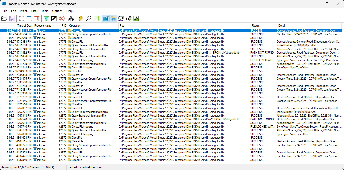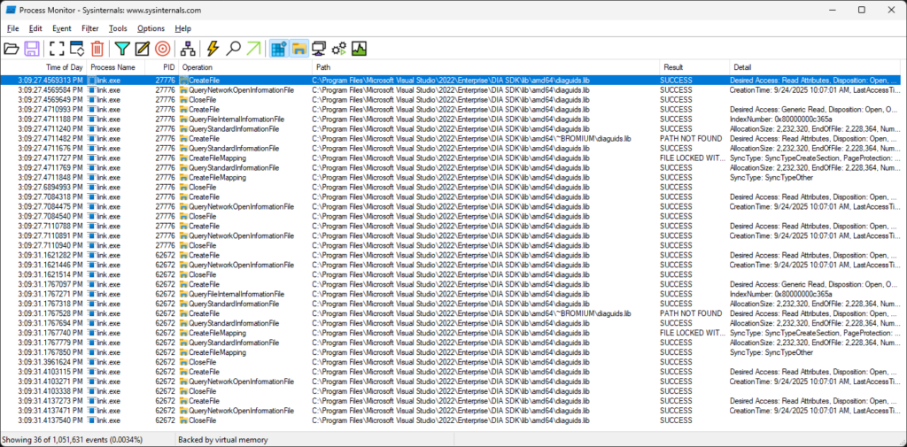 I started Process Monitor and added a filter for path containing “slowdebug”. Notice tons of PIDs for gtestlauncher.exe in the process monitor screenshot below (as expected).