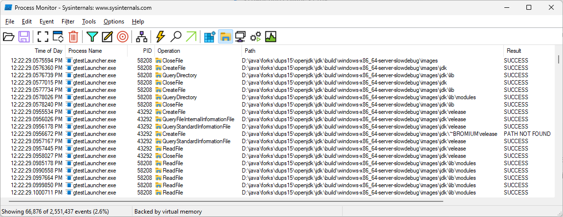 I moved on to testing the build but this time it didn’t work! I added some debug output in Display GetLastError() on failure to load DLL · swesonga/jdk@ce7143e. GetLastError was 126, i.e. “the specified module could not be found” as per the System Error Codes (0-499) (WinError.h). I verified that the path to jvm.dll was valid then used Process Monitor to record events on the system while running java.exe. Turns out I needed to copy libffi-8.dll into the directory containing jvm.dll.