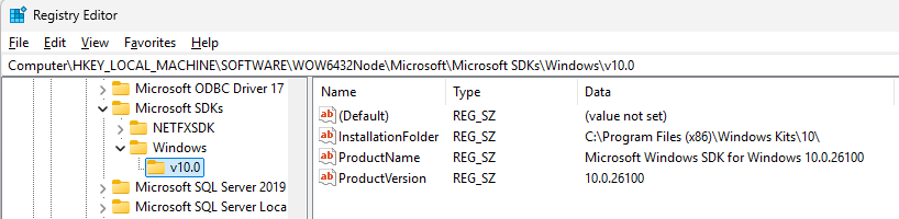 More specifically, it searches in the Microsoft\Microsoft SDKs\Windows\v10.0 subkey of each of them for the InstallationFolder value. The WindowsSdkDir environment variable is set to the value found here. It would be set to “C:\Program Files (x86)\Windows Kits\10\” on my machine (shown below).