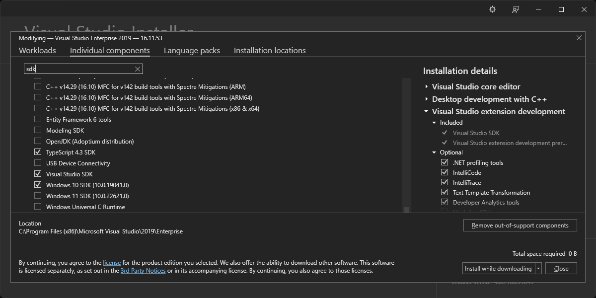 The Visual Studio 2019 installer showed only the Windows 10 SDK installed: