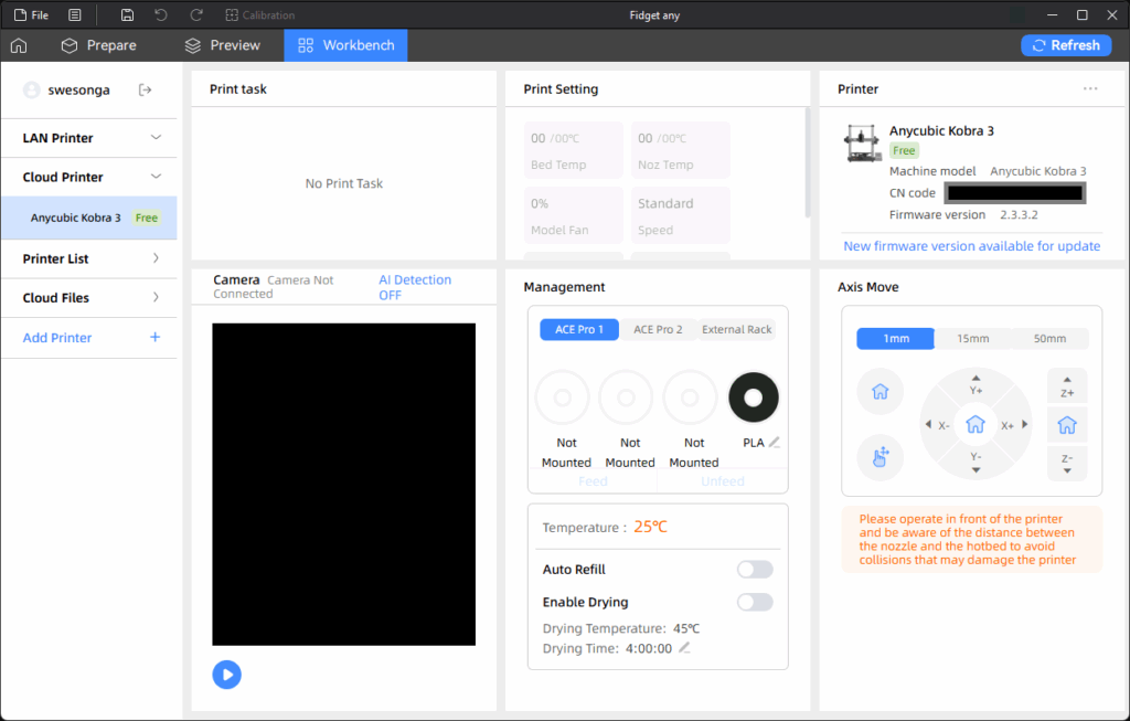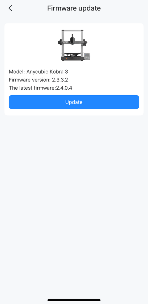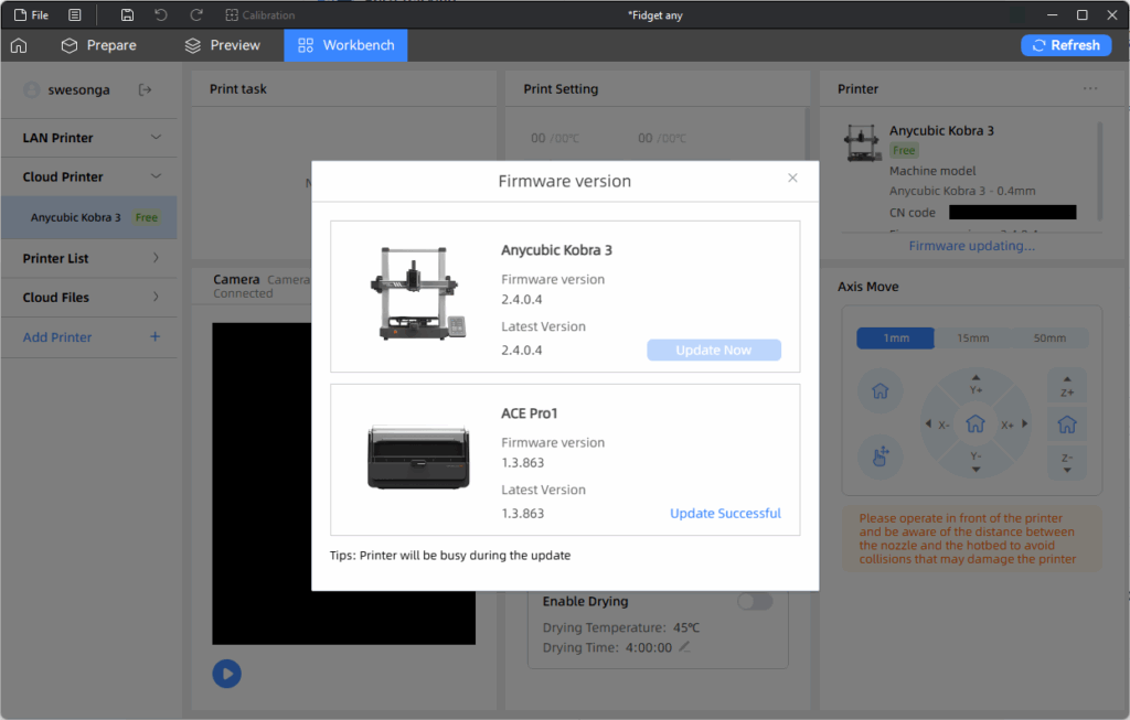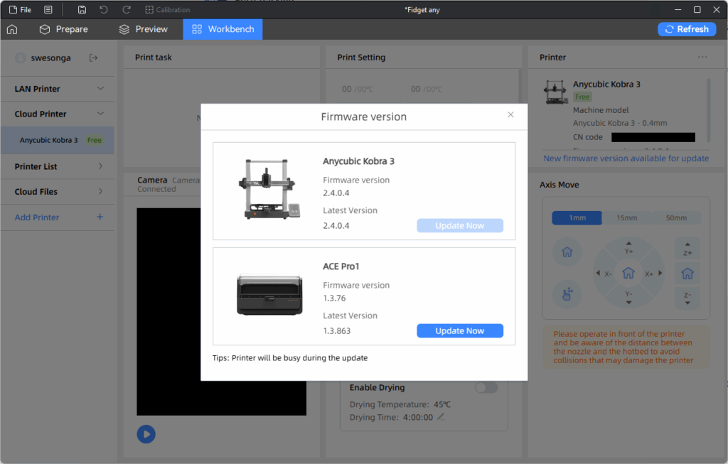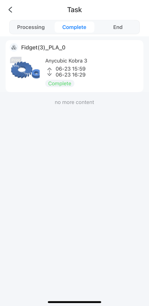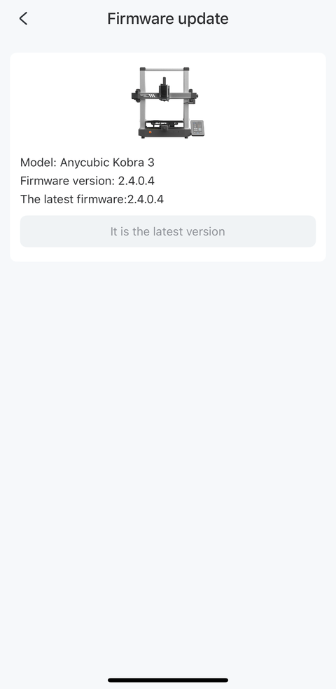 The job started above is the first fidget task I manually ended in the “End” tab of the Tasks page in an earlier screenshot of the app on my phone. After I installed the firmware update using my phone, there was still a “New firmware version available for update” message in the Printer section but it turned out the update was for the ACE Pro this time: