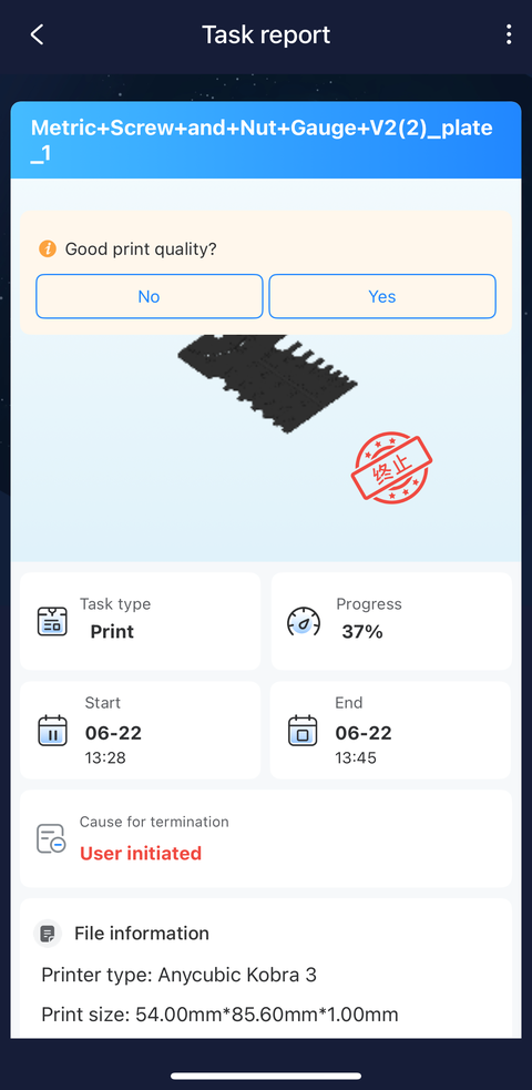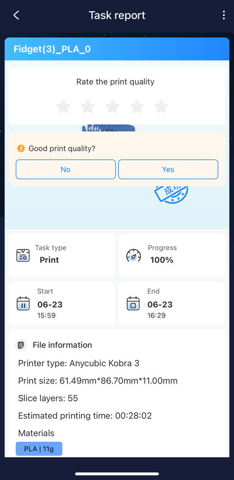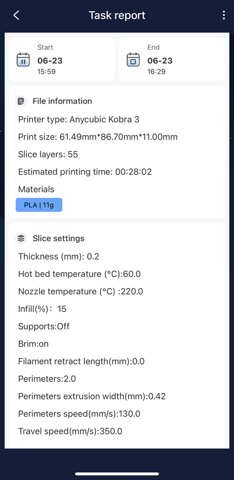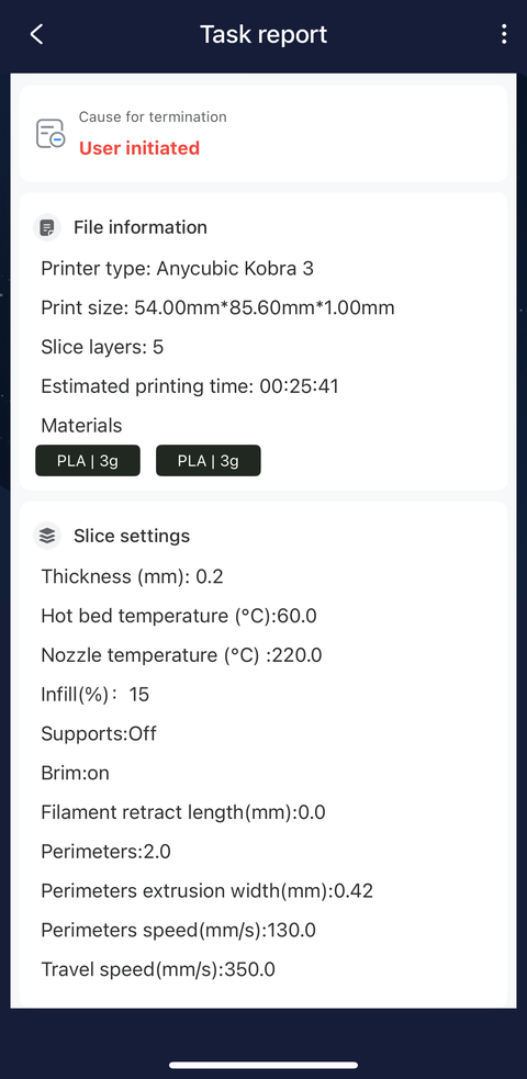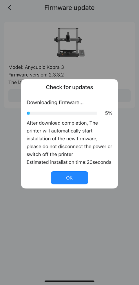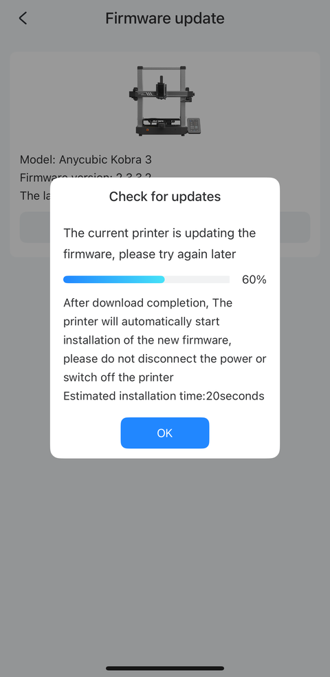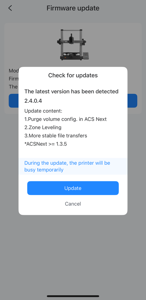 The job started above is the first fidget task I manually ended in the “End” tab of the Tasks page in an earlier screenshot of the app on my phone. After I installed the firmware update using my phone, there was still a “New firmware version available for update” message in the Printer section but it turned out the update was for the ACE Pro this time: