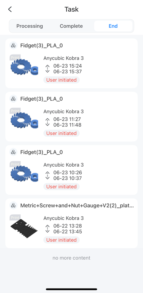 The same thing happened again so I cancelled the printing task. I had set up the 3D printer on a stand-up desk which had a little bit of swaying motion when the printer was at work so I moved the 3D printer onto the floor to see if this could have been the problem. The same broken model was being printed with the printer on the floor so I cancelled the task again. However, this enabled me to rule out the stability of the print platform. The tasks I cancelled are in the “End” tab, along with their start and end times in the images below.