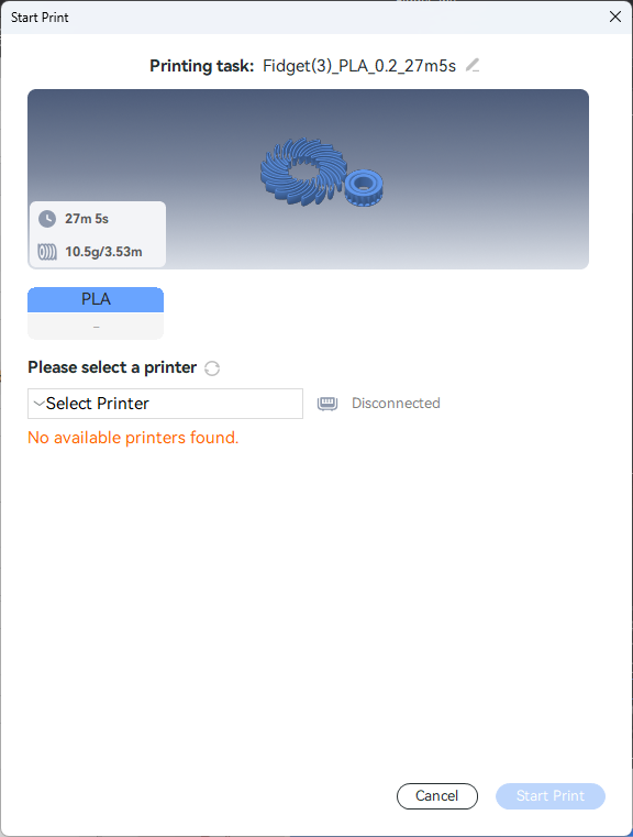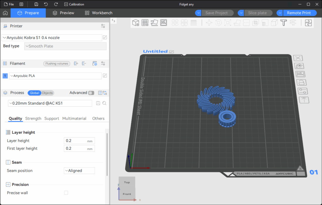 I decided to print a different model, a simpler one, to see if perhaps the model is at issue. This (mostly) circular fidget toy seemed ideal because its dimensions meant that it had to be centered on the build platform.