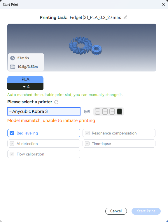I needed to switch from the Anycubic Kobra S1 0.4 nozzle. Why is this one selected anyway if I only checked mine in the initial startup prompts? Switching to the right printer enabled the print task to start: