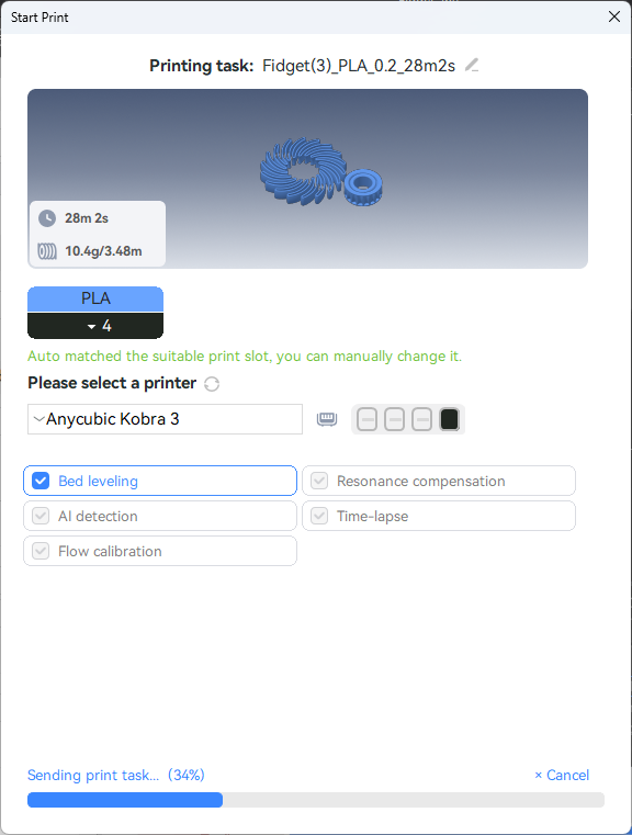 This was when I realized that the orientation of the filament when I loaded it into the ACE (Anycubic Color Engine) was off by 180-degrees around the z-axis. The link is to CODE: 11519 Filament tangle detected, please organize the filament and resume printing | Anycubic Wiki. I re-adjusted the roll and was able to resume printing. The dialog below marked the completion of the final print (after the Y-axis belt was tightened):