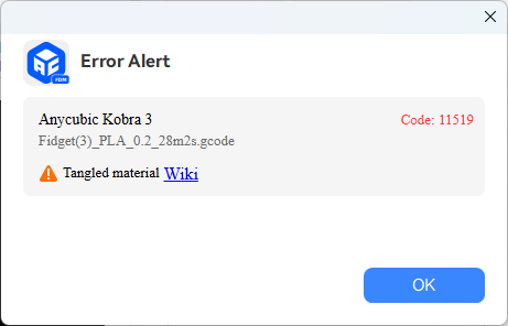 With both devices’ firmware up to date, I started the second attempt of the fidget toy (which failed due to the aforementioned lose Y-axis belt). One error that popped up was this tangled material error alert.