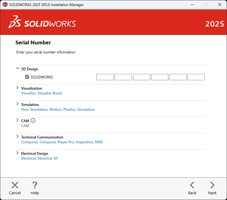 On the Serial Number screen, enter your latest serial number [1234…] manually in the 3D Design > SOLIDWORKS checkbox only. Please leave all the other product’s [like composer, Visual, simulation, etc..] serial number checkboxes blank and unchecked. See the attached image for your reference.